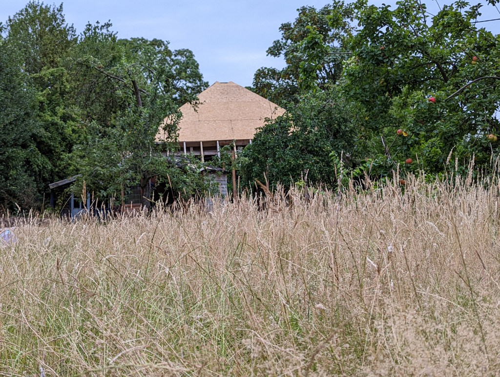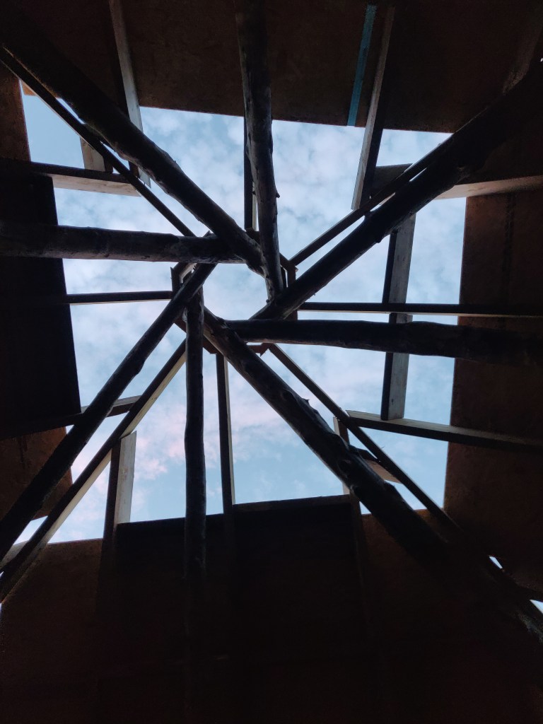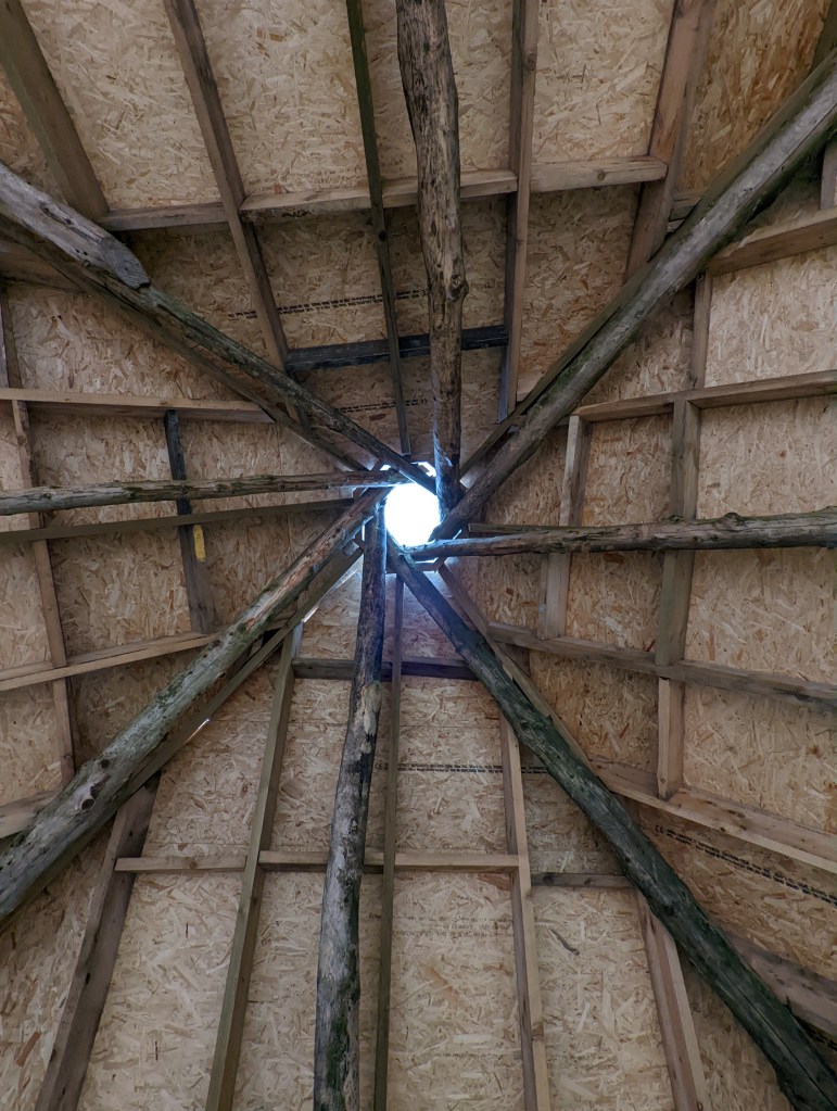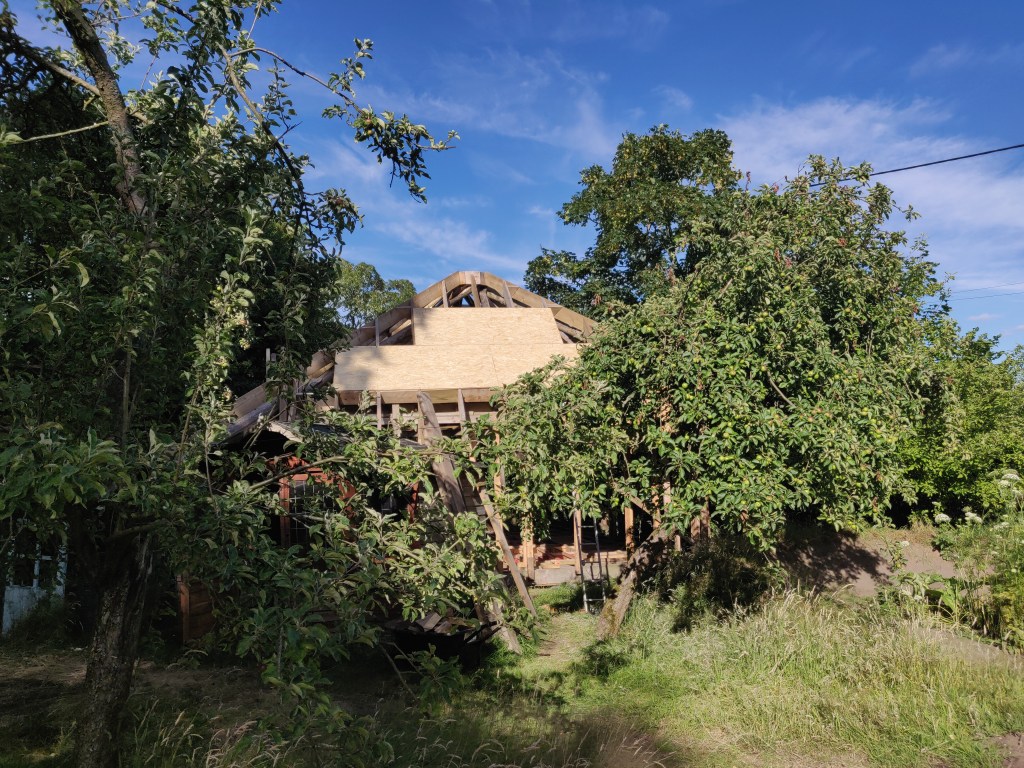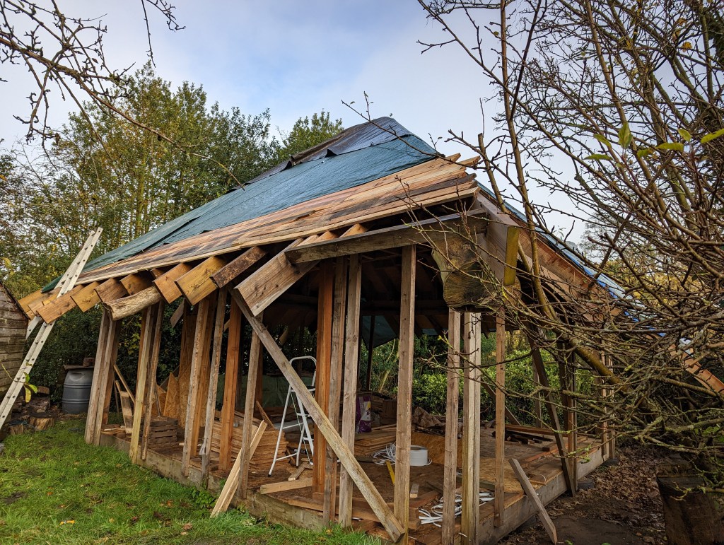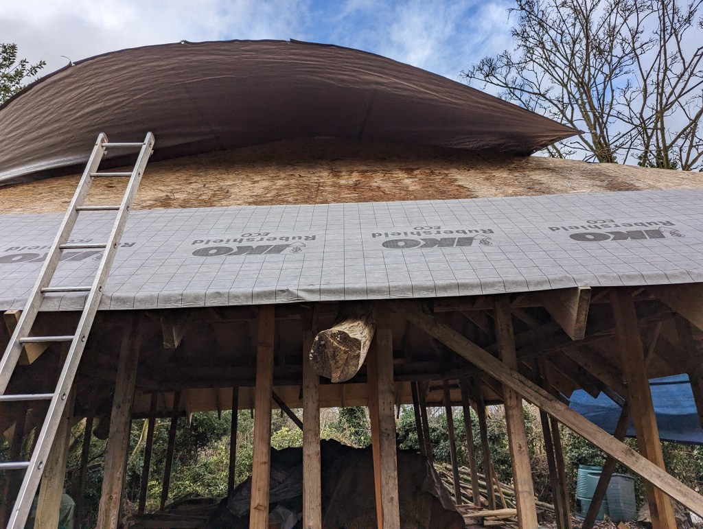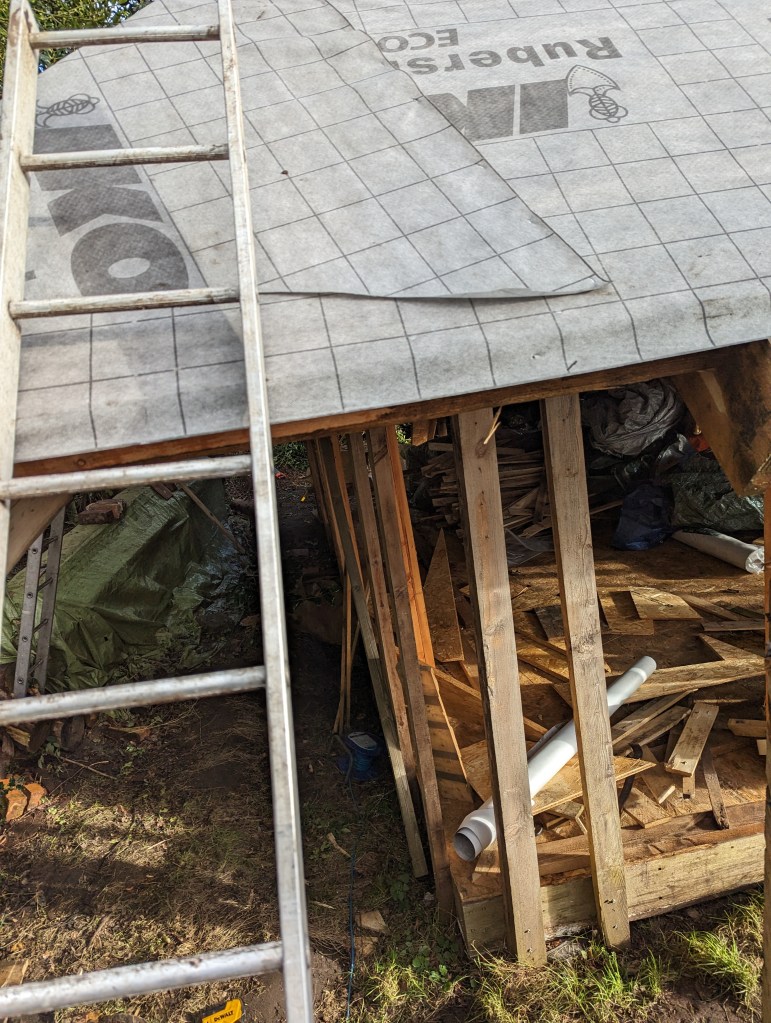 One day it was very windy and all the tarps blew off the roof. Instead of trying to put them back on I decided it was time to put the roof membrane on to make things properly waterproof.