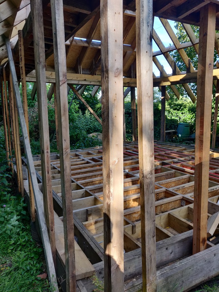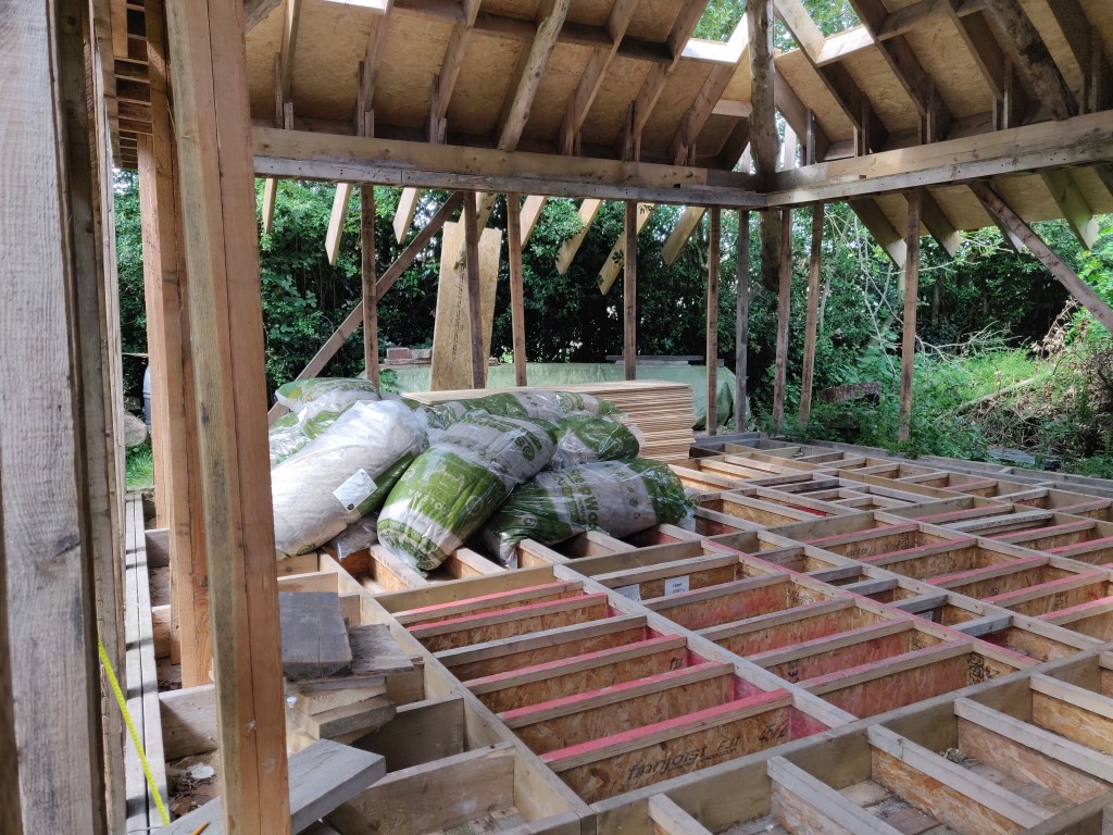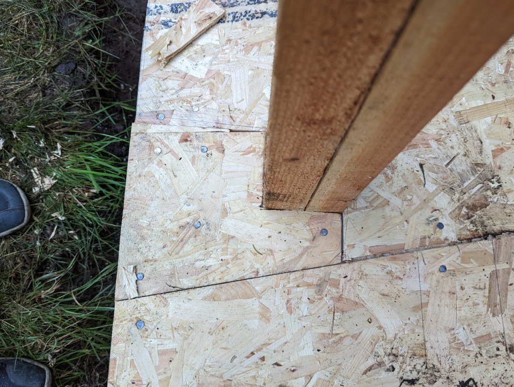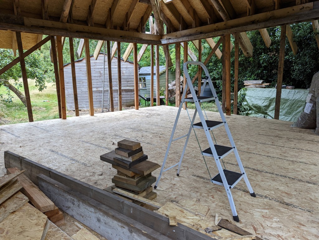 The base plate and floor was boarded over with 18mm SmartPly OSB. The plans specified that the base plate was boarded, and the the floor done later, but the advantage to doing it this way is that you get a continuous run of boards so a much more airtight floor.