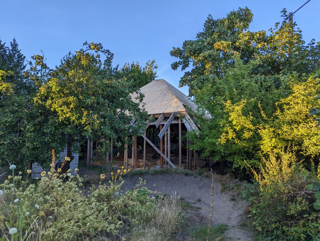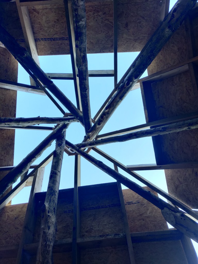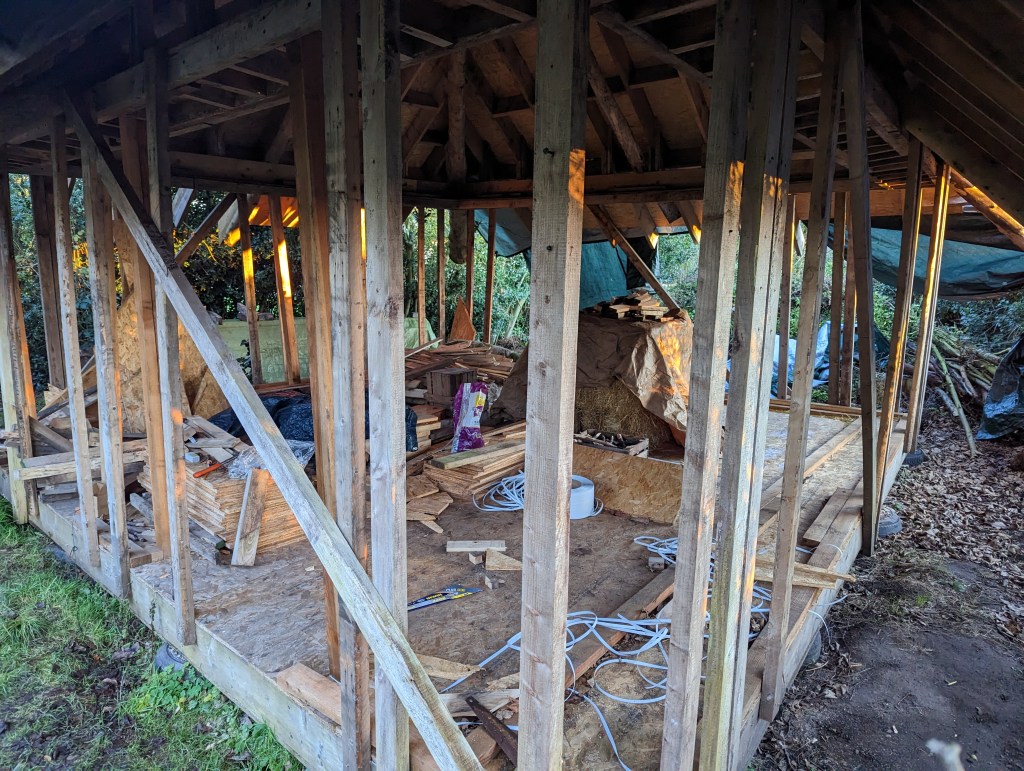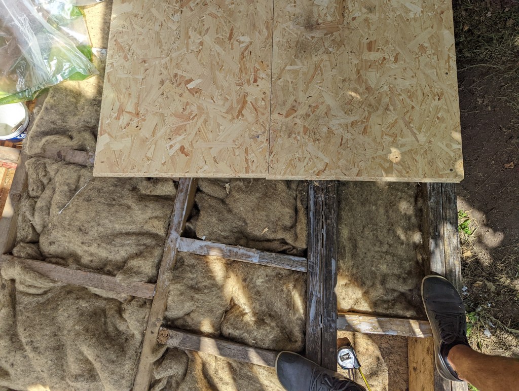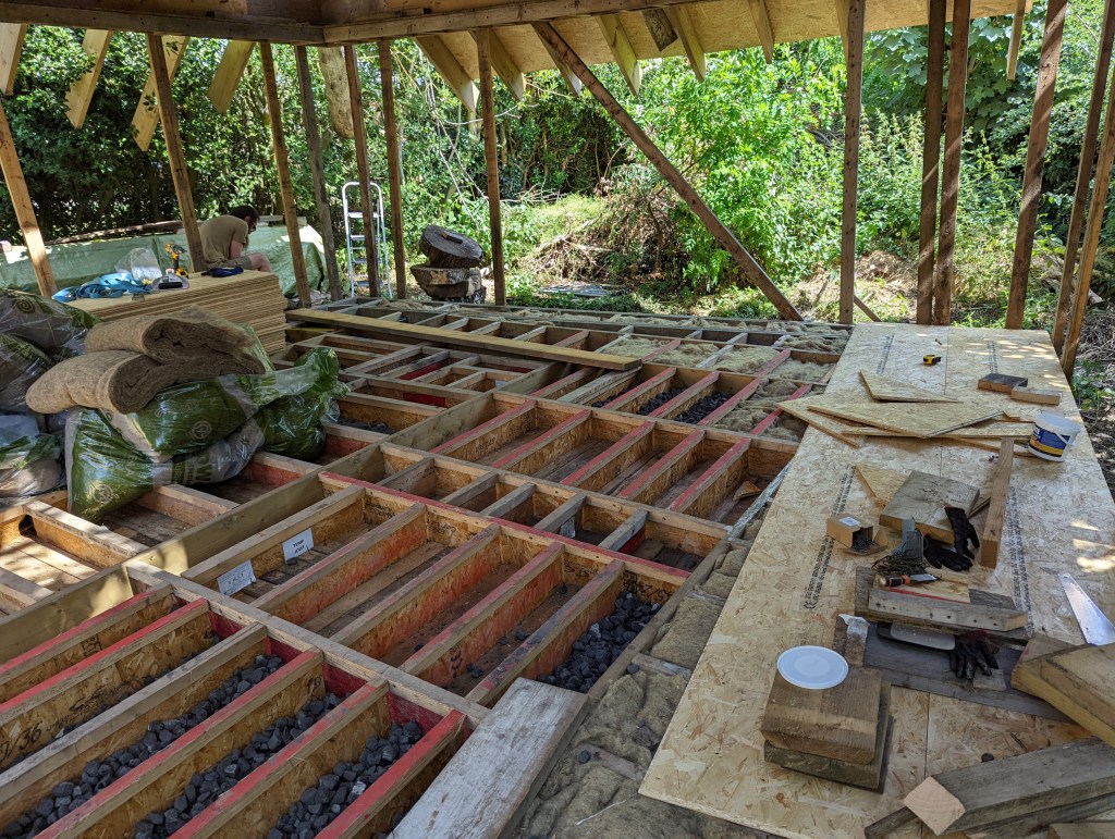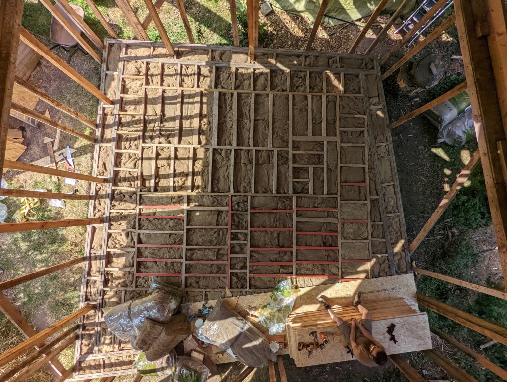 The next step was to cover the roof with OSB. This will serve several functions. It keeps the rain off the building, so I can store the straw inside without it getting wet. It also adds racking strength to the roof. It also will enclose the sheep’s wool insulation making it more effective. It also gave us shelter from the sun while we were doing the floor.
