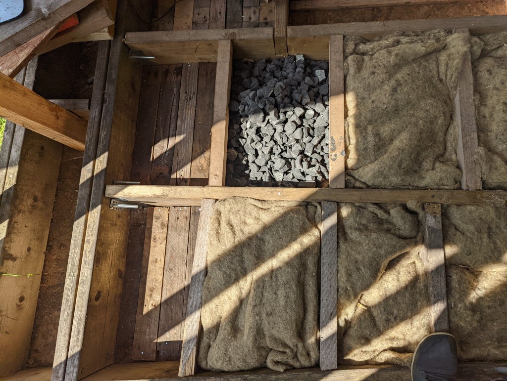 The floor cavities were filled with FoamGlas chunks, and then a layer of sheep’s wool insulation.