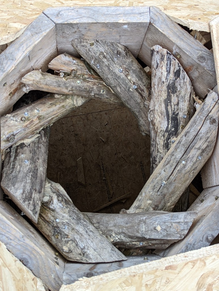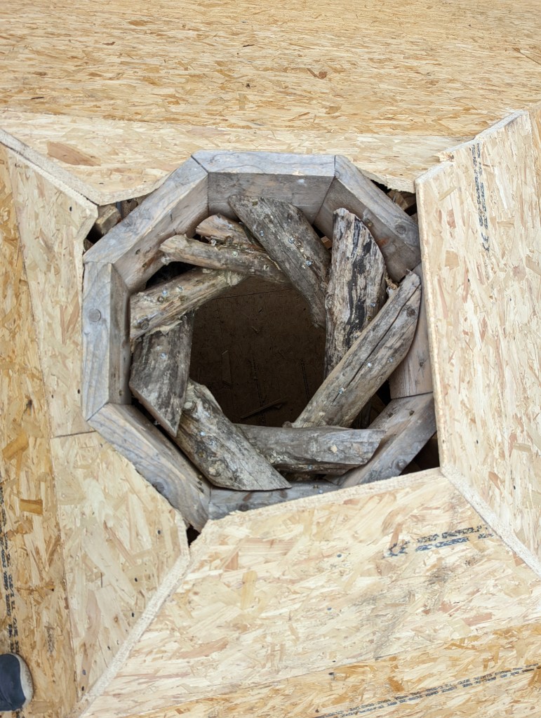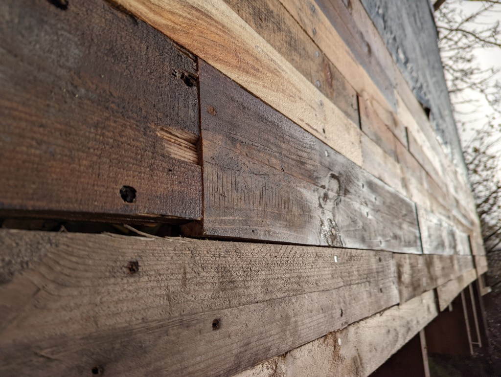 The bottom of the roof was finished with a mixture of the OSB offcuts and pallets. This section doesn’t need to be wind/air tight as it’s an overhang, so it’s not over the livable area of the building.