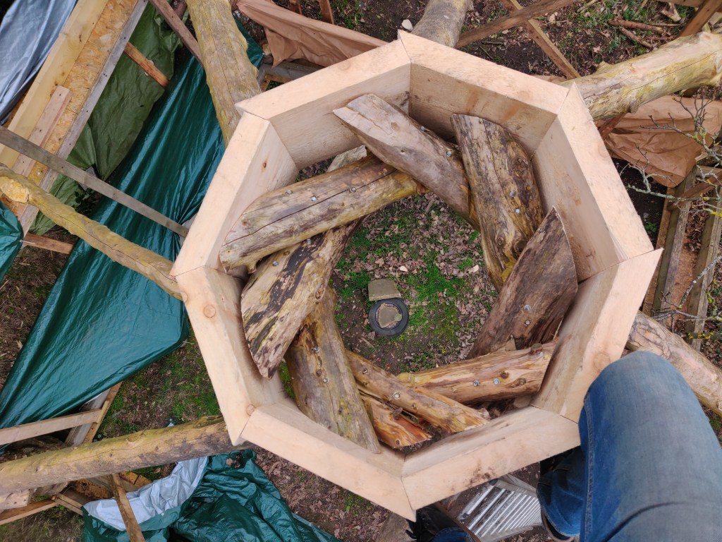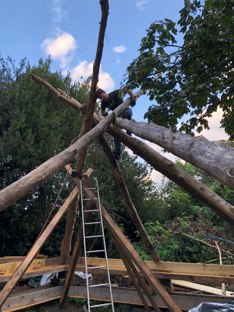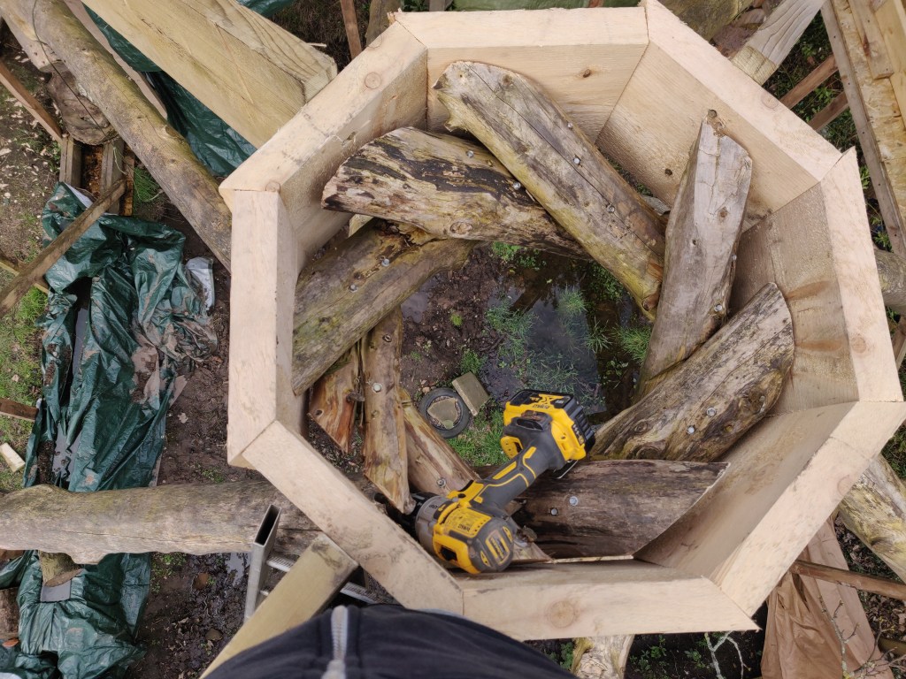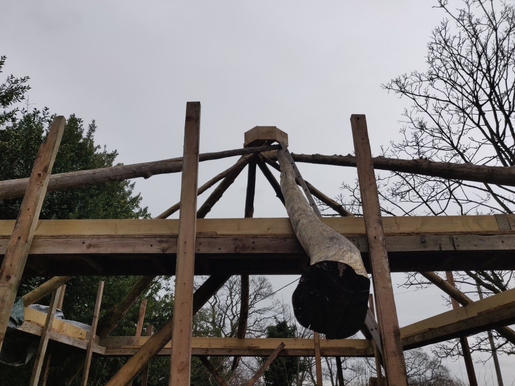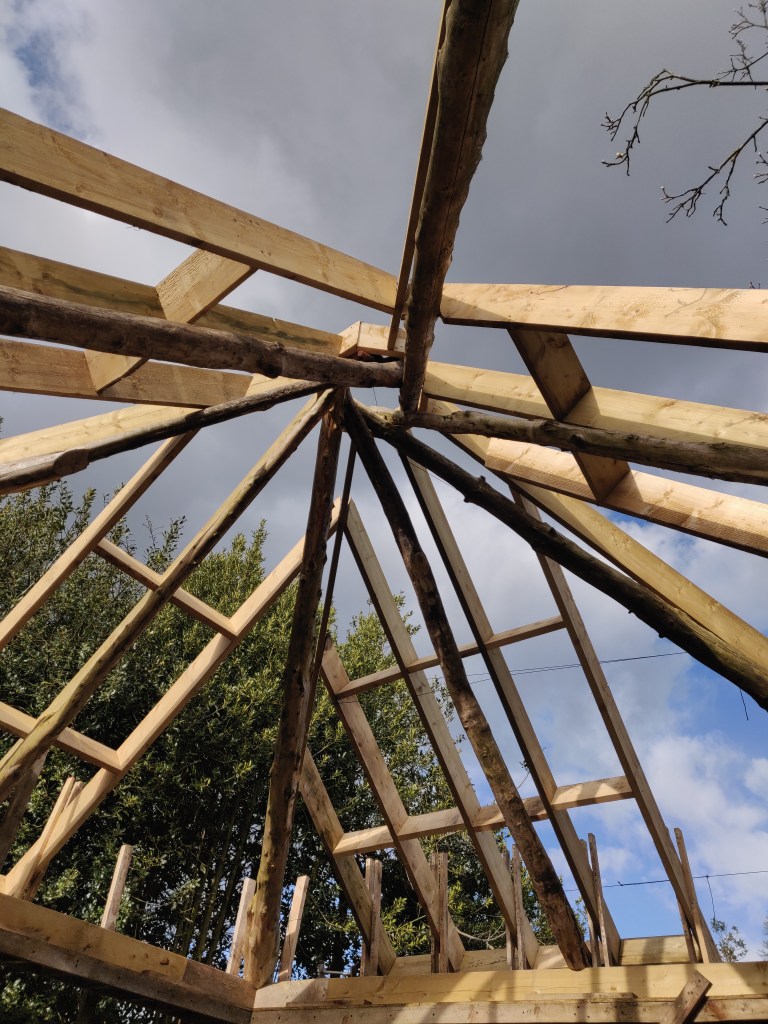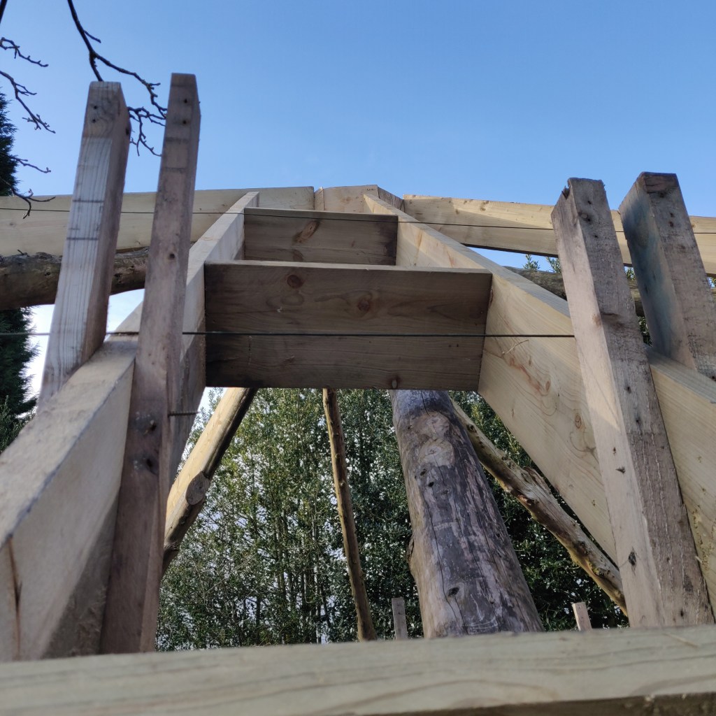 Once the roof was up to height, the next step was to build a ring beam to go at the top of the reciprocal roof, to attach the rafters too.