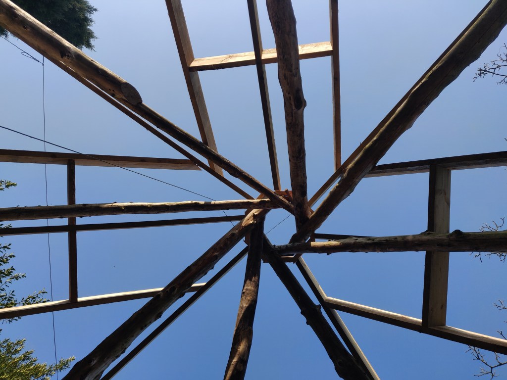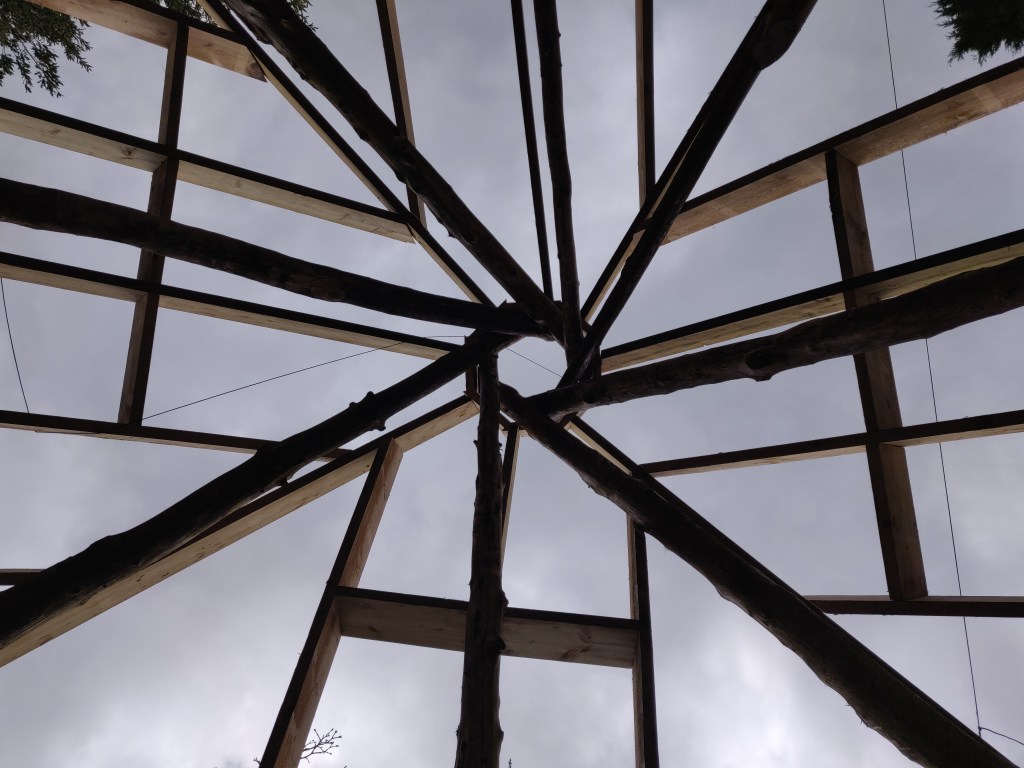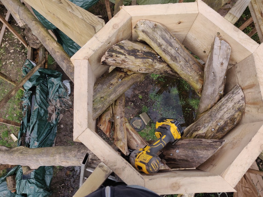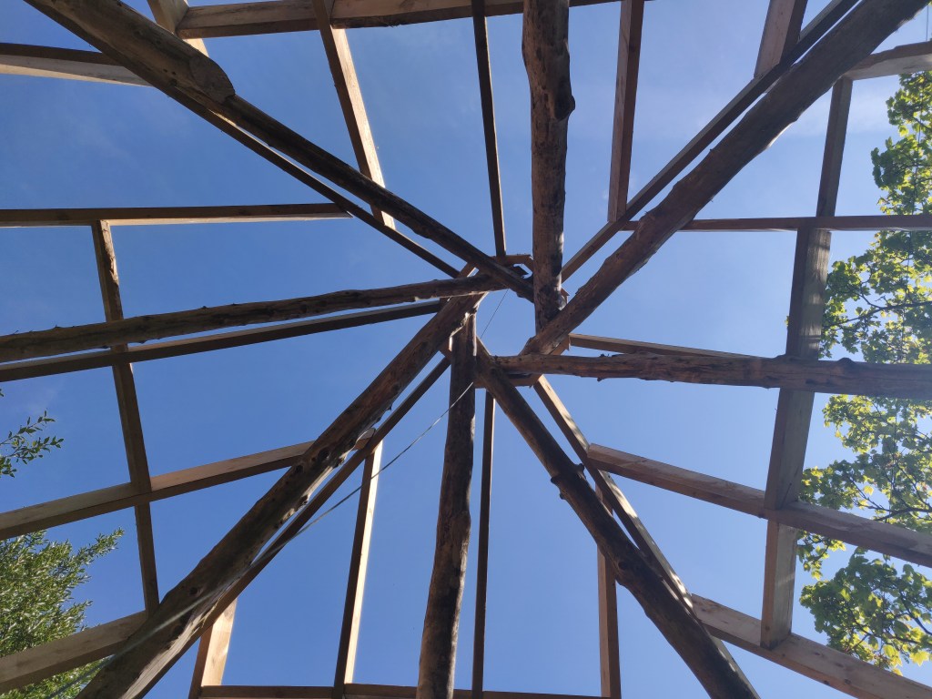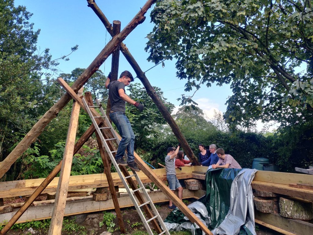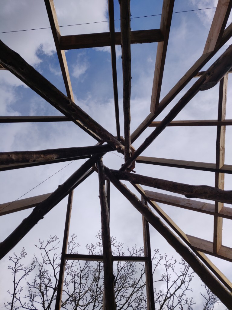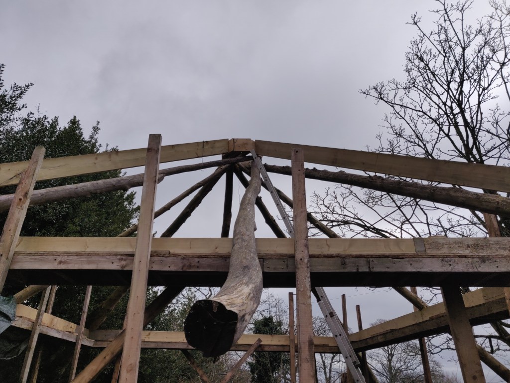 Once the roof was up to height, the next step was to build a ring beam to go at the top of the reciprocal roof, to attach the rafters too.