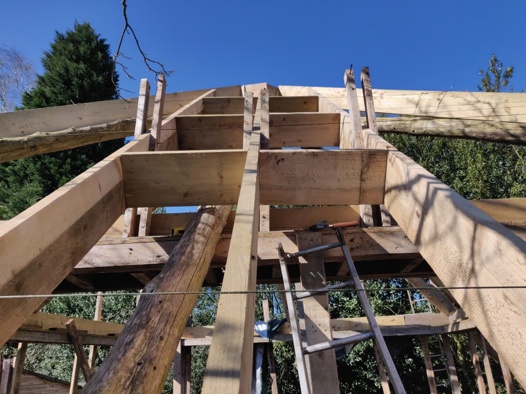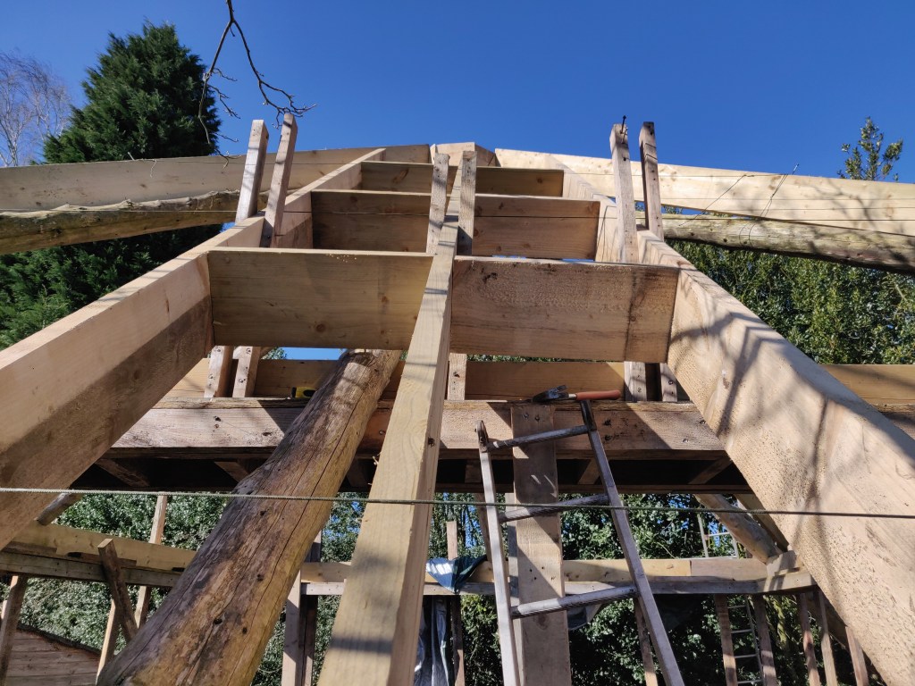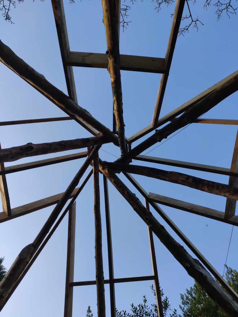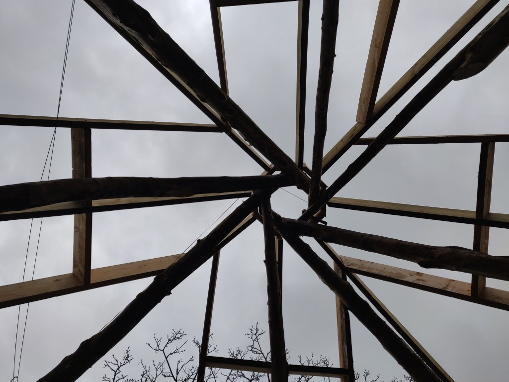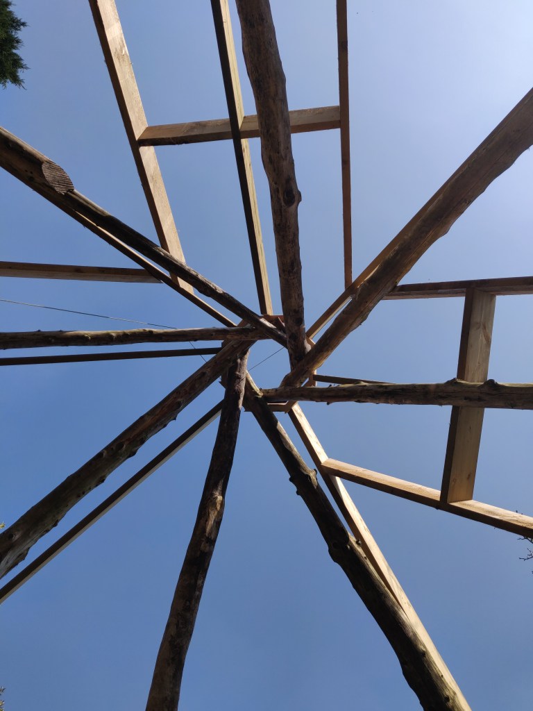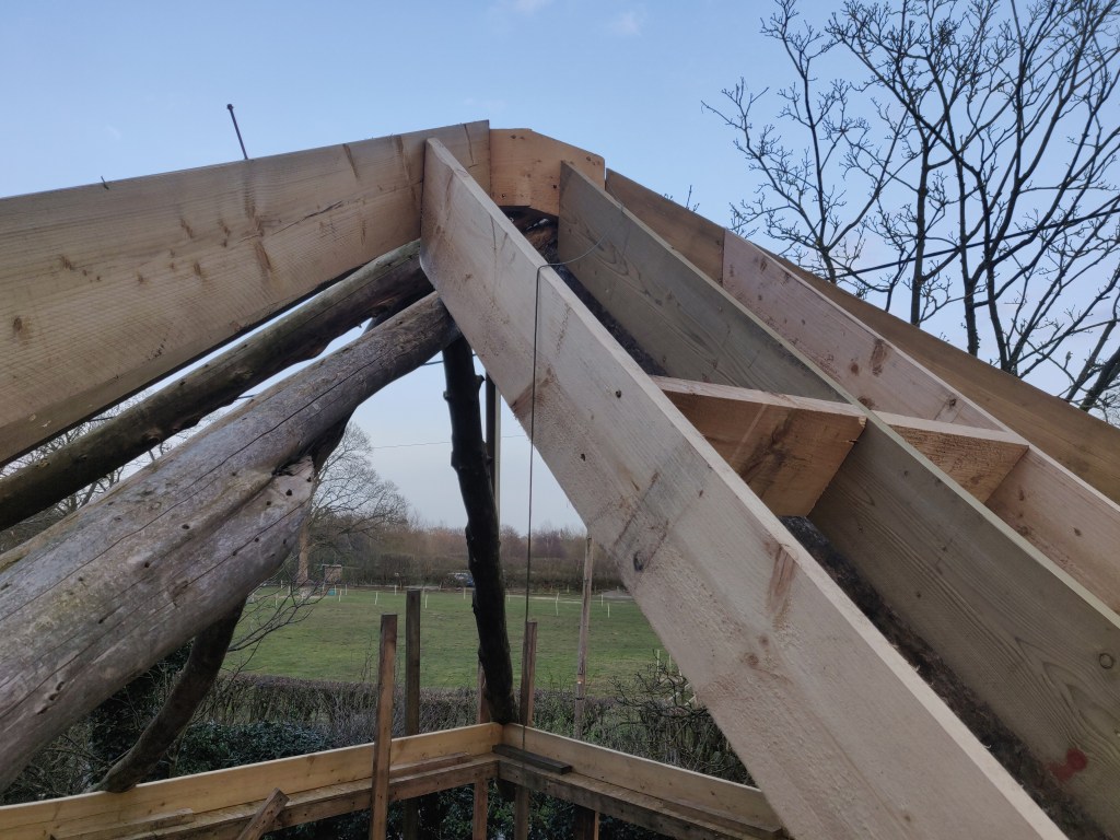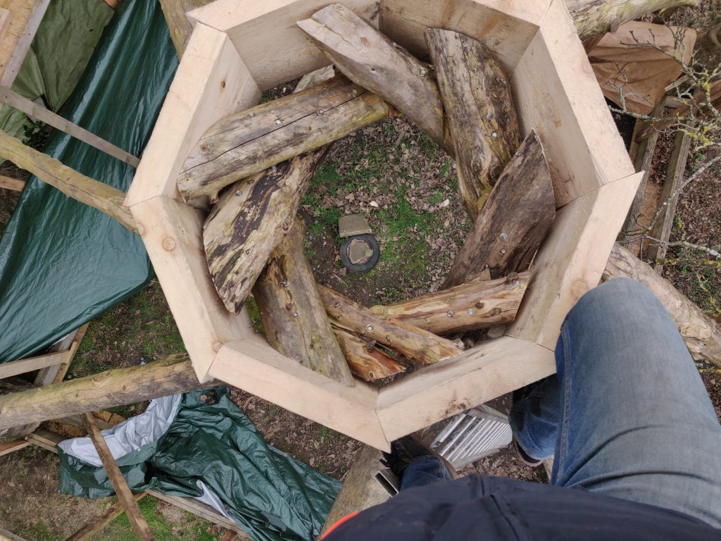 Once the roof was up to height, the next step was to build a ring beam to go at the top of the reciprocal roof, to attach the rafters too.