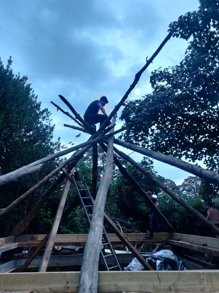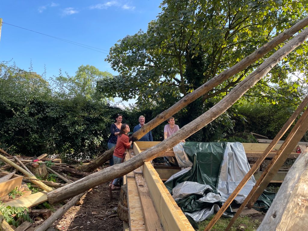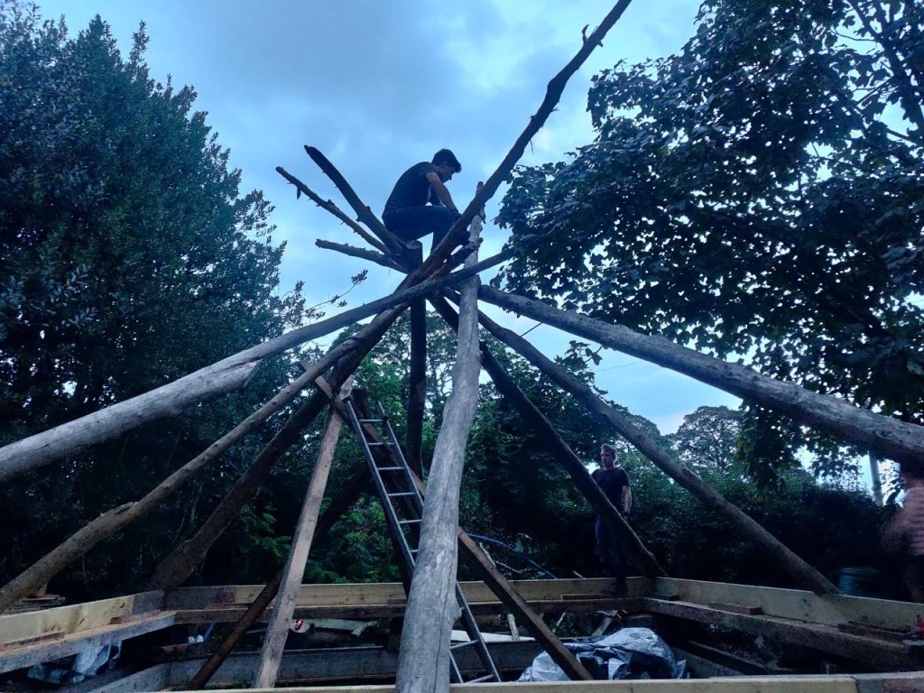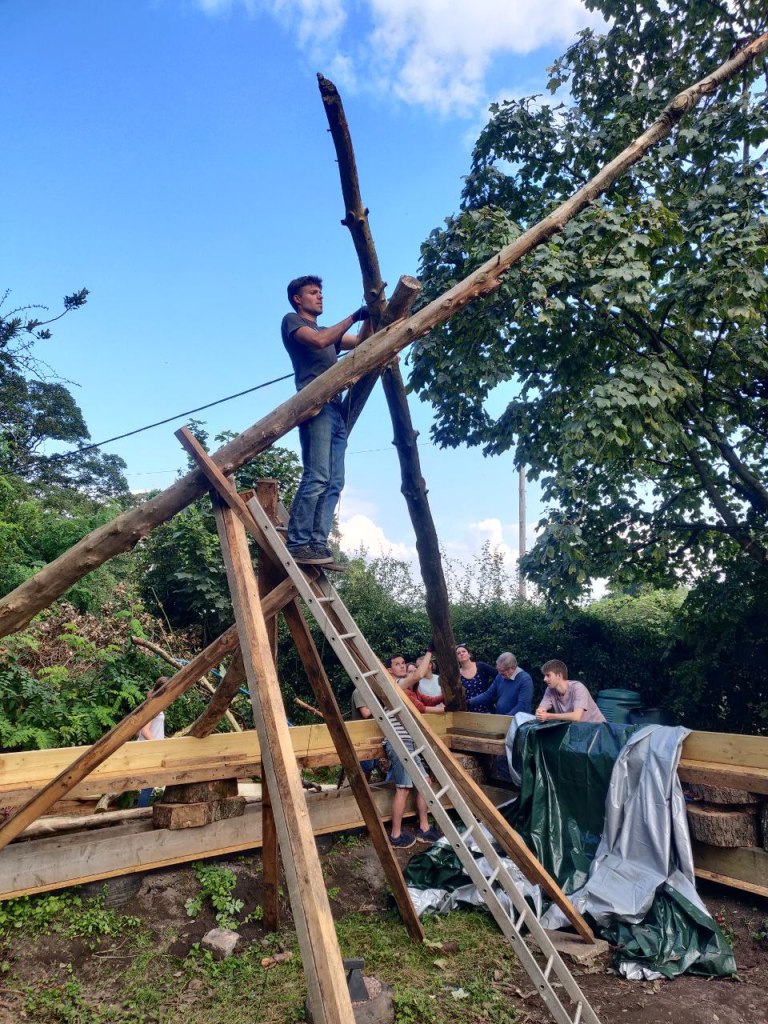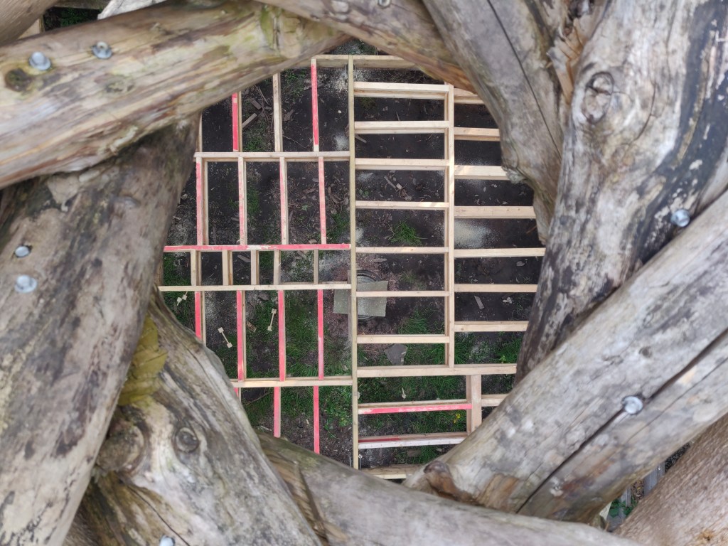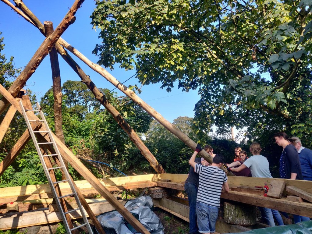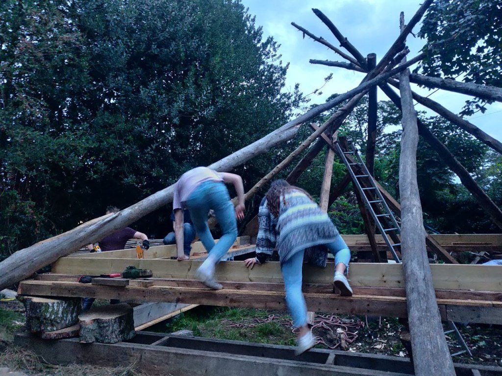 Once the roof was up to height, the next step was to build a ring beam to go at the top of the reciprocal roof, to attach the rafters too.