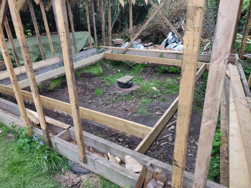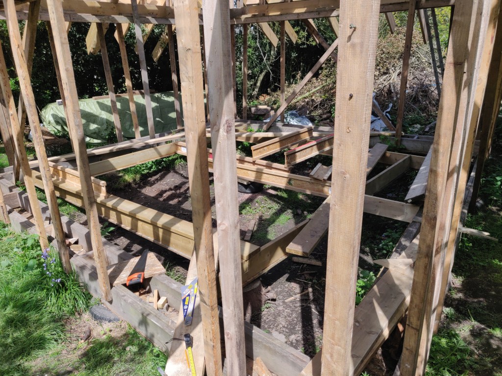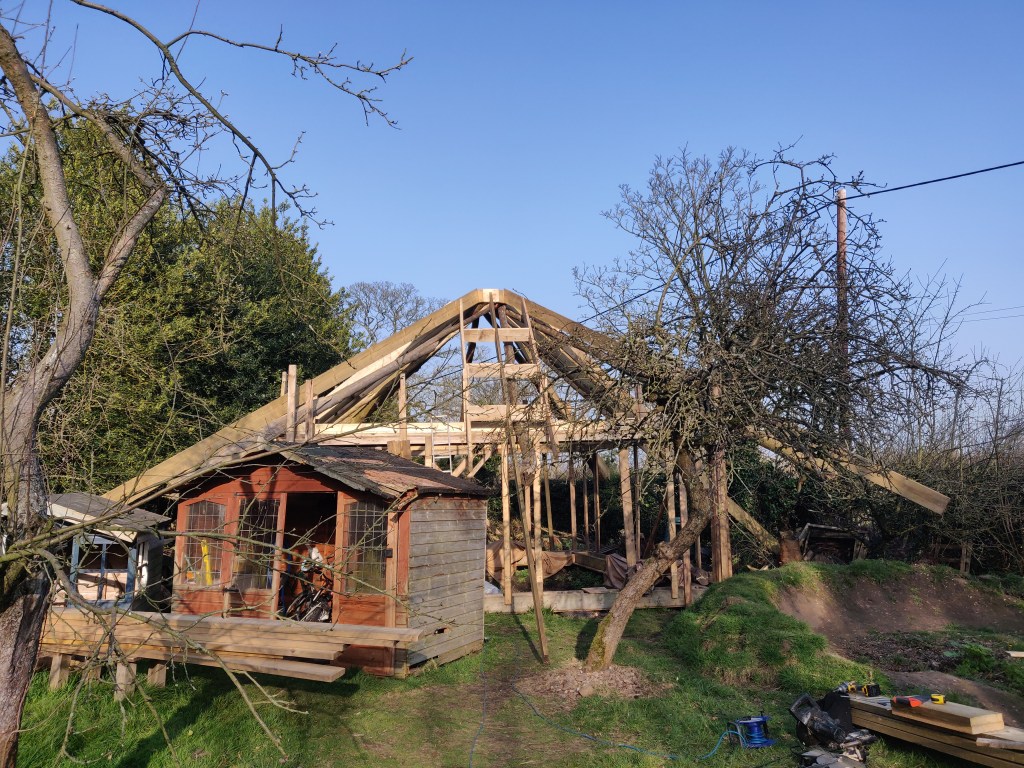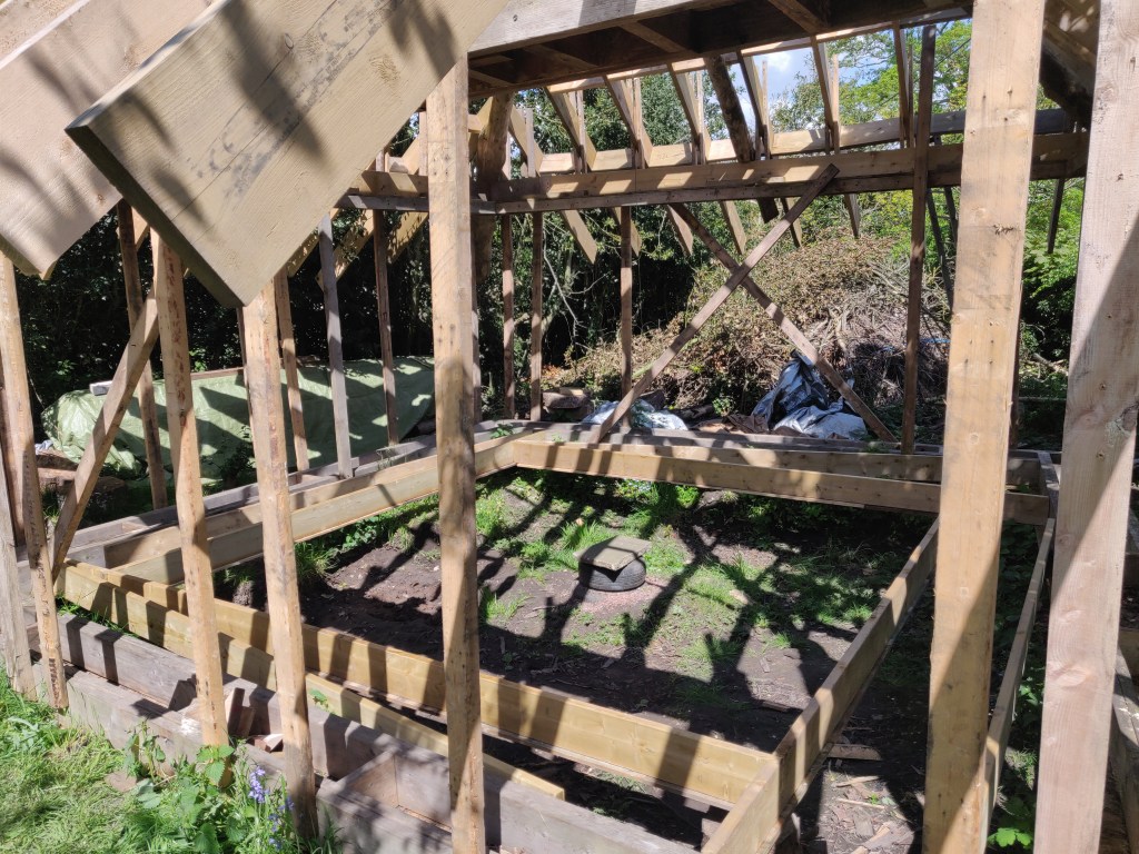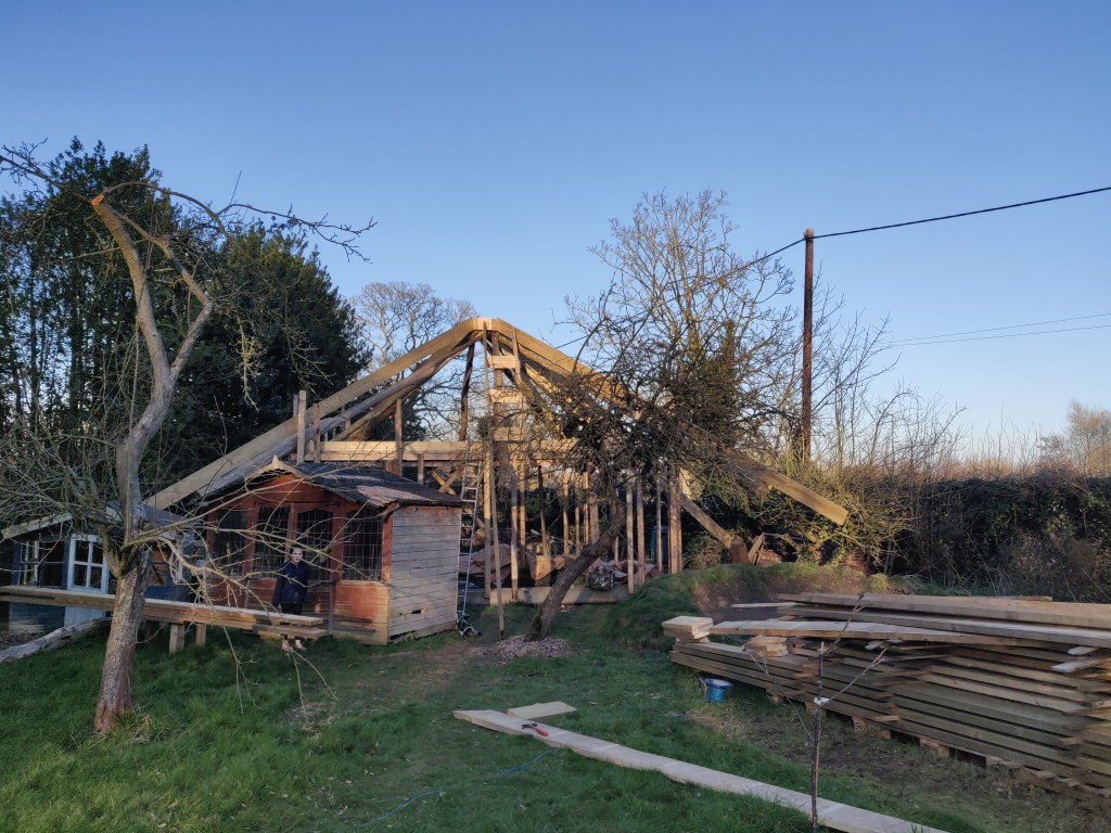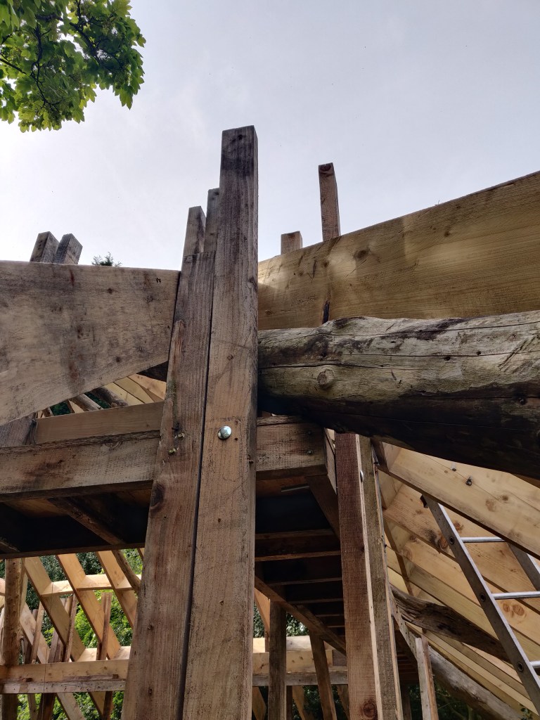 Once the roof timbers were in place it was time to raise the roof plate to the right hight to fit the bales in. One obvious question is, why not do this before the rafters were on – surely that would have been much easier.