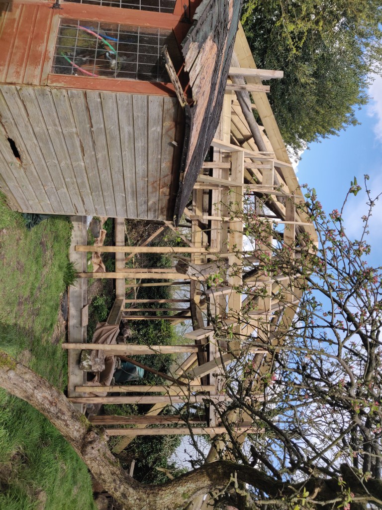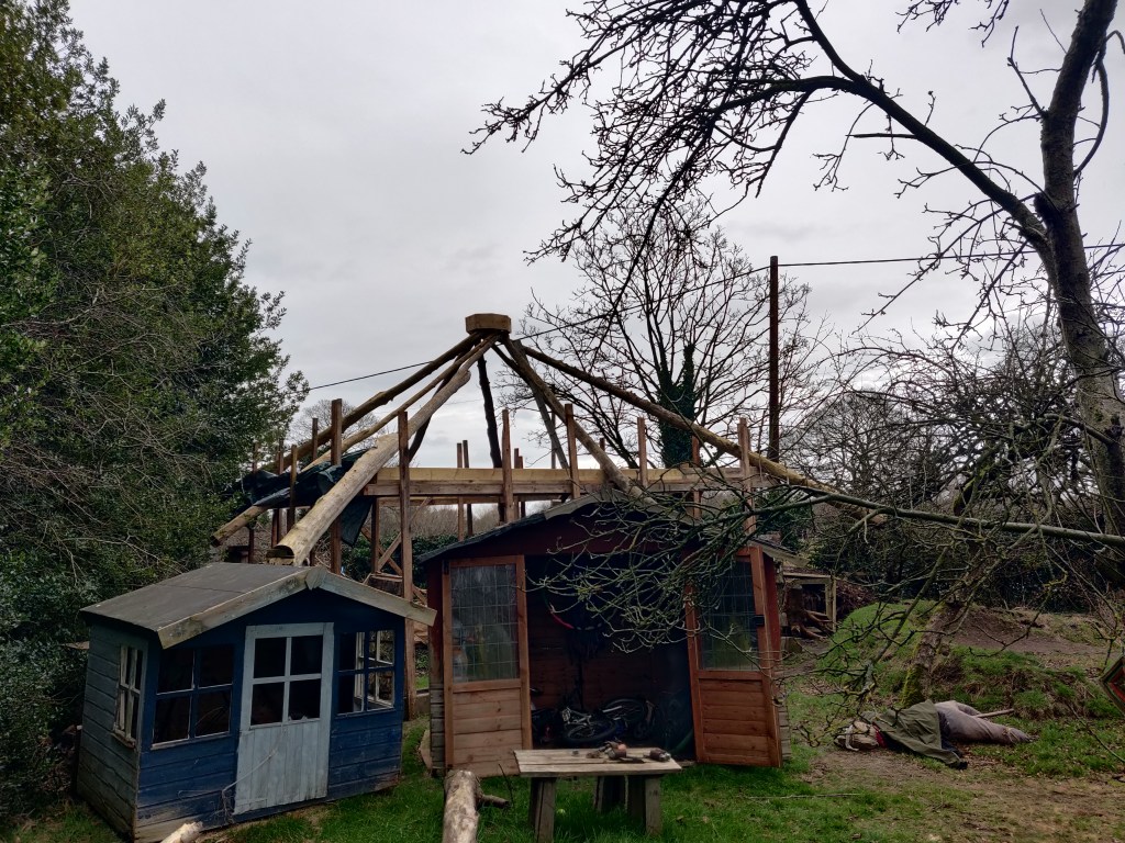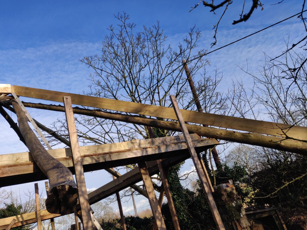 One unintended consquence of raising the roof in the way that I did was that the roof didn’t go up evenly. This caused the pins holding the rafters in place to snap and the whole thing collapsed on itself