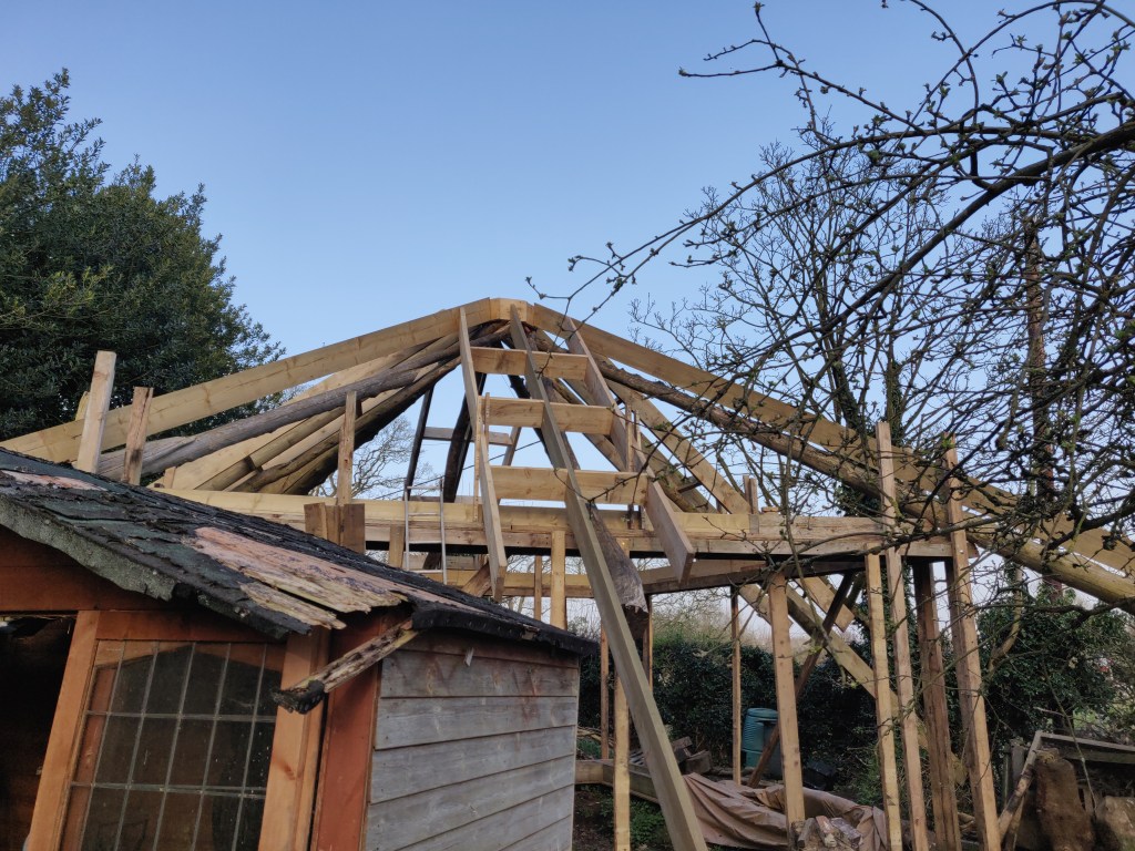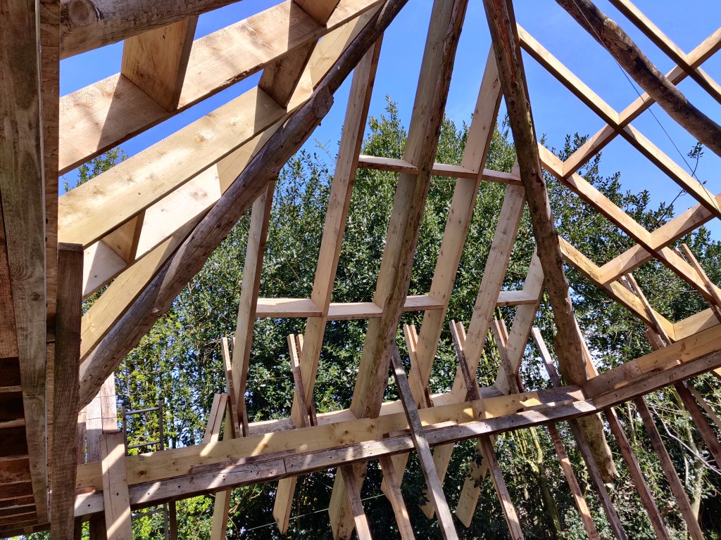 Another difficulty is getting the angles correct. These timbers join the hip rafters so they are angled in two dimensions. I used an angle measurer to match the angles on the hip rafters. Every one had to be individually cut to size as nothing is standard. I cut them all using a handsaw. A cut like this that goes in two different angles is hard to cut by hand, but after a while you get the hang of it. The key is to draw the lines on the timber, then hold the timber so that both lines appear straight, and cut down that straight line.