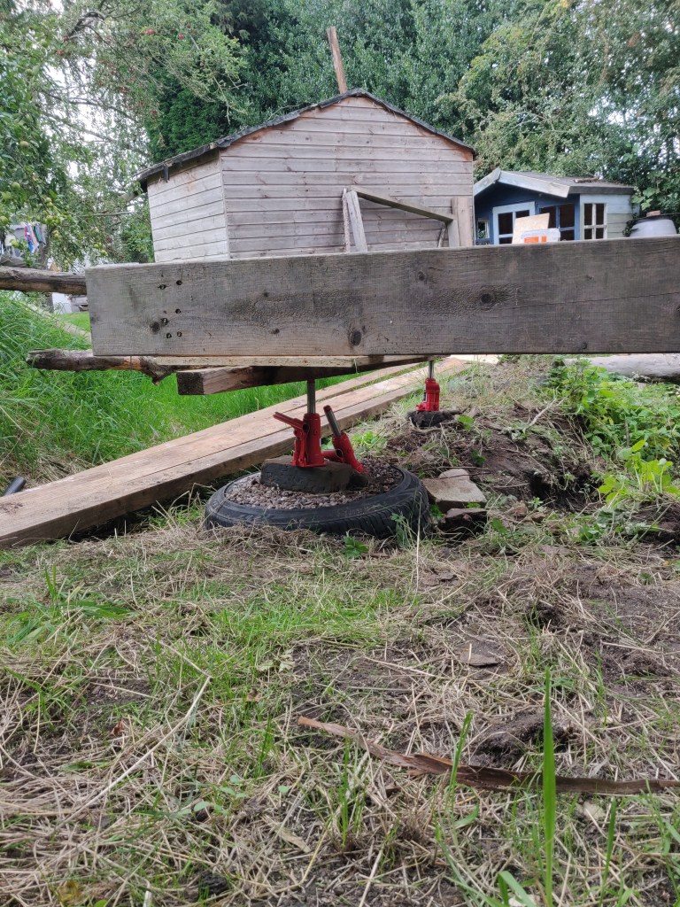 However, I realied that I needed to attach the boards to the underside of the base plate before I got too far with the rest of the building otherwise. It’s OSB3 so it lasts pretty well in the rain anyway. I used bottle jacks to lift it up, and then glued and nailed them on. This was pretty tricky.