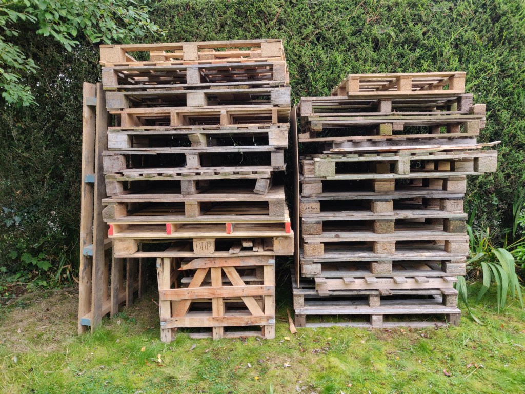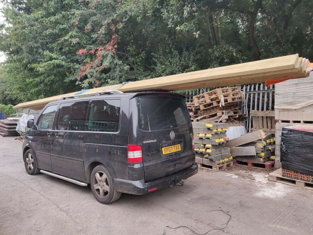 10 metre long timbers on the roof of the van. A stack of pallets (for the floor). Roof timbers stacked up.